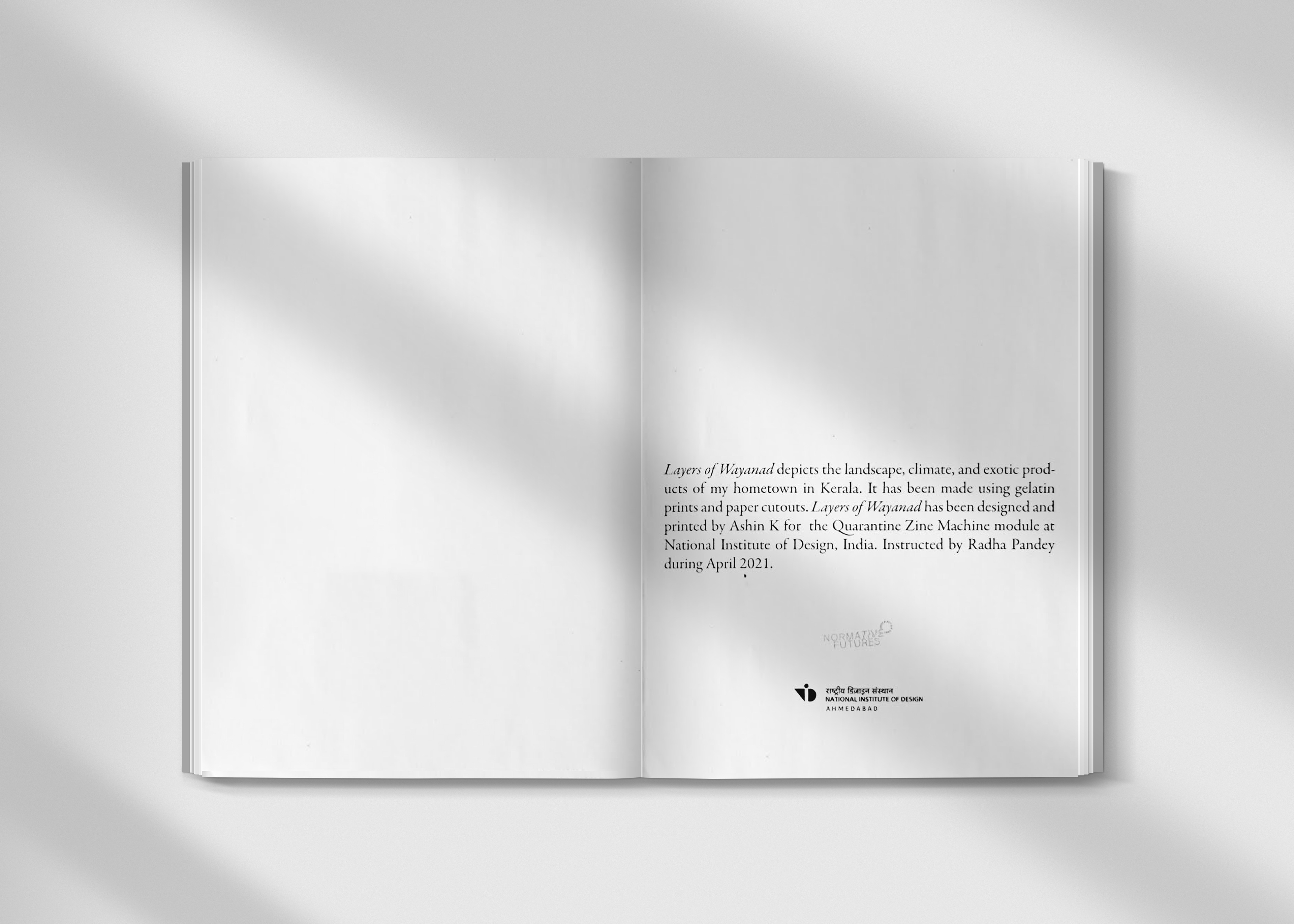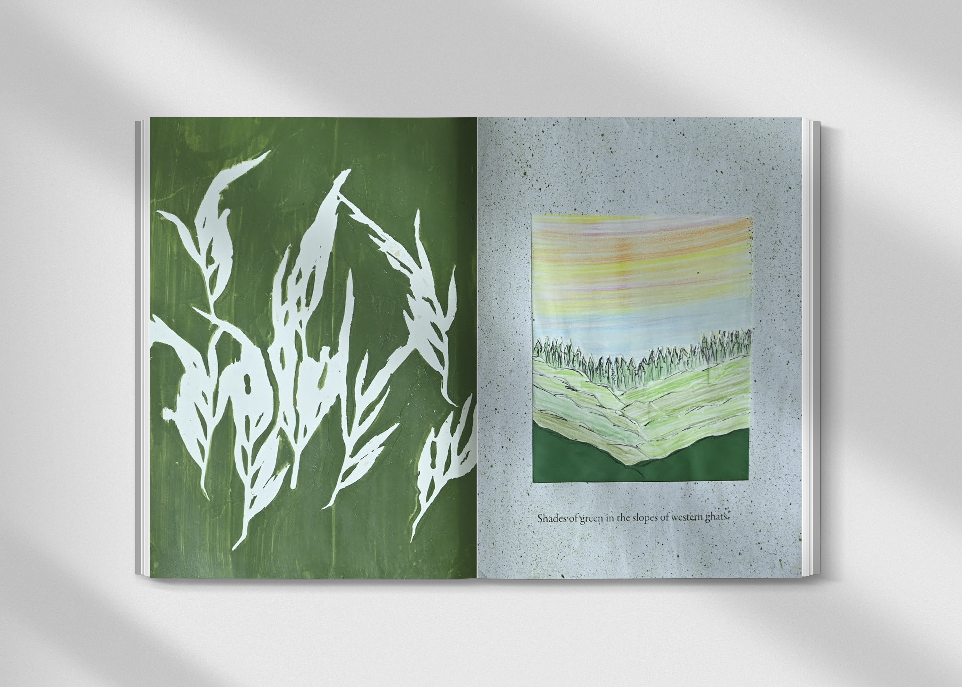 Layers of Wayanad is a zine that intends to showcase the experience of the Wayanad landscape. This is a handmade zine and gelatin printing and paper popups were used. The zine is sewn bound by making sections.